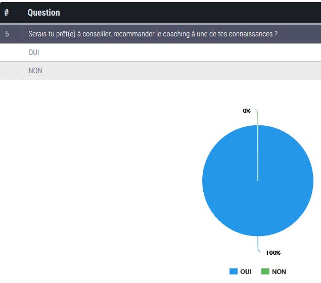 • 80% se déclarent très satisfaits du coaching et 20% satisfaits.